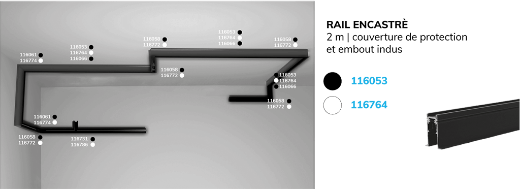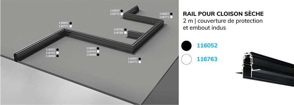 Rail en saillie, rail encastré ou rail suspendu, nous avons une solution adaptée à chaque domaine d'application. Nos différents types de rails couvrent tous les besoins. Choisissez librement votre type de montage en fonction de vos besoins. Découvrez-le maintenant !