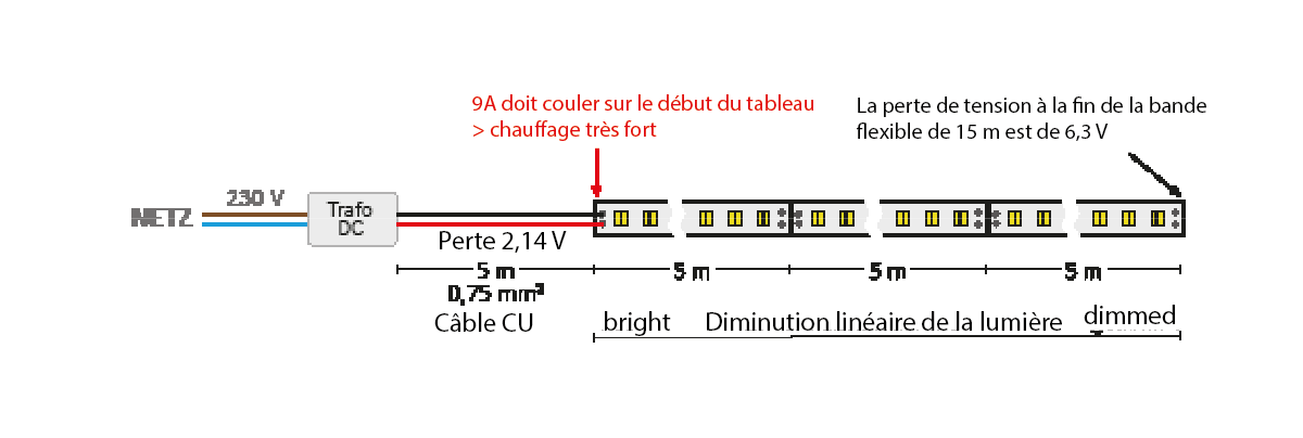 Plus la puissance par mètre est élevée, plus le courant nécessaire est important et donc la chute de tension :