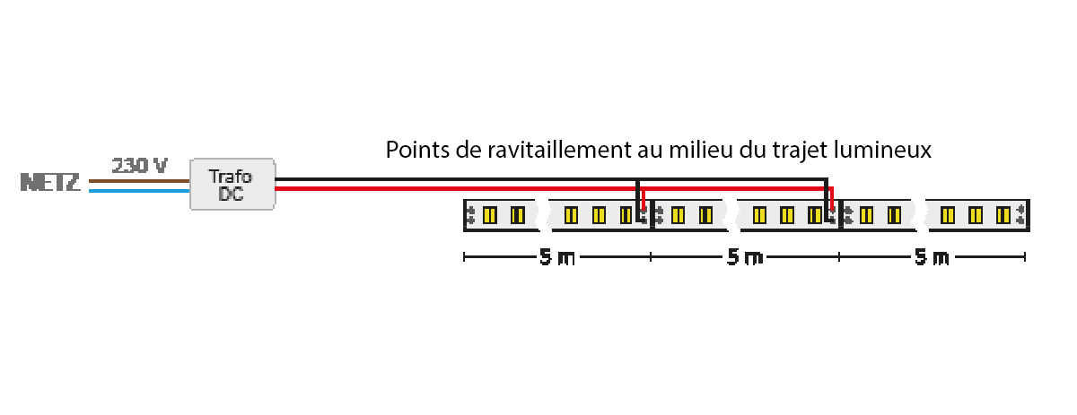 Conseil 1 Points d'alimentation parallèles à 5 m et 10 m le long de la ligne lumineuse
